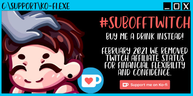 We've moved away from Twitch in terms of supporting the community financially. Streaming and marketing the way we were cost more than it was feasible. We want to do more giveaways, more charity, and give more back to the community--especially when in need. Our subscription button on Twitch is gone with our Affiliate contract. This: